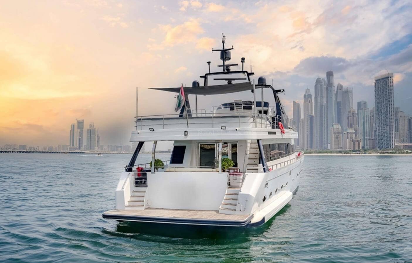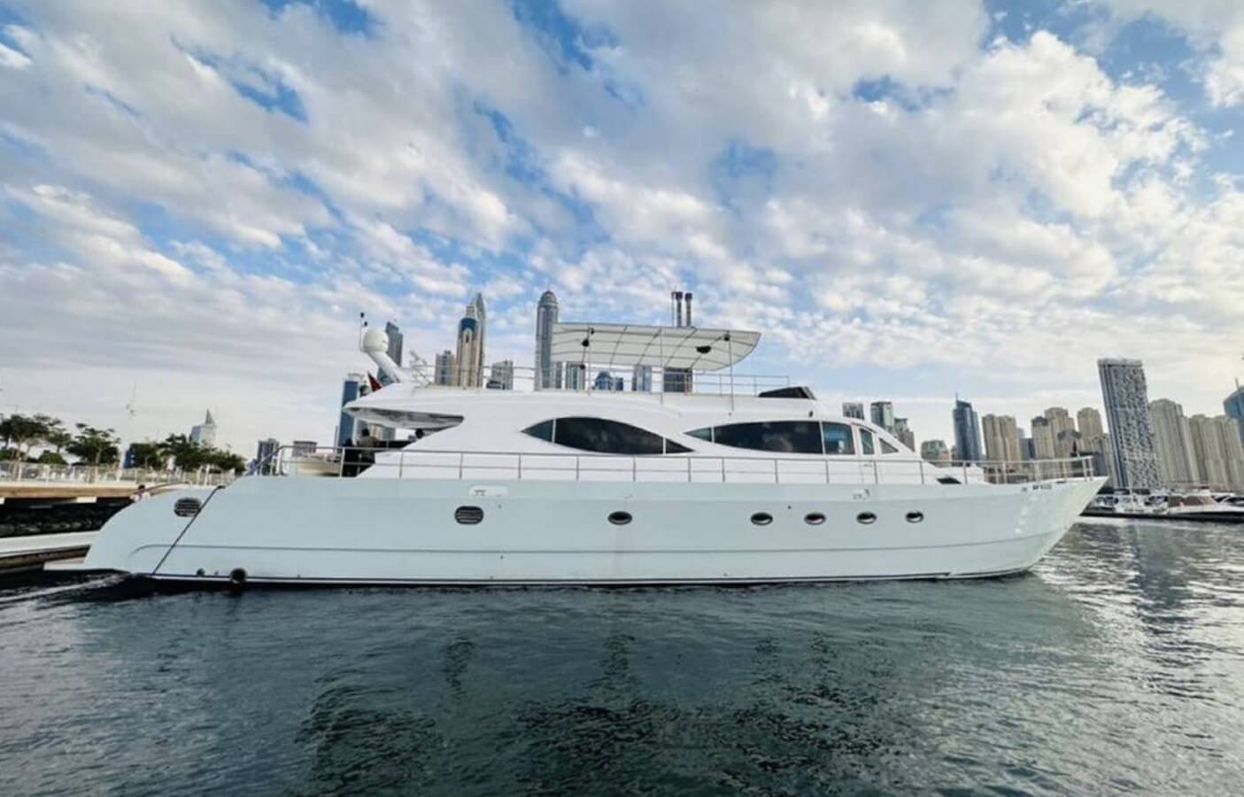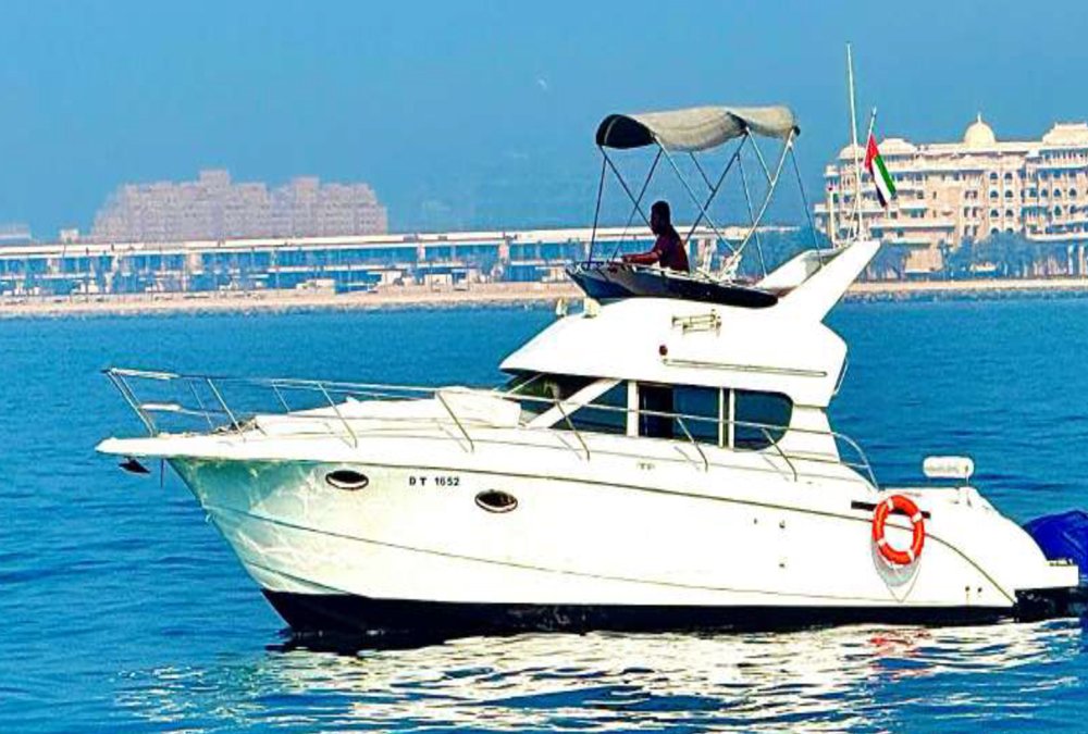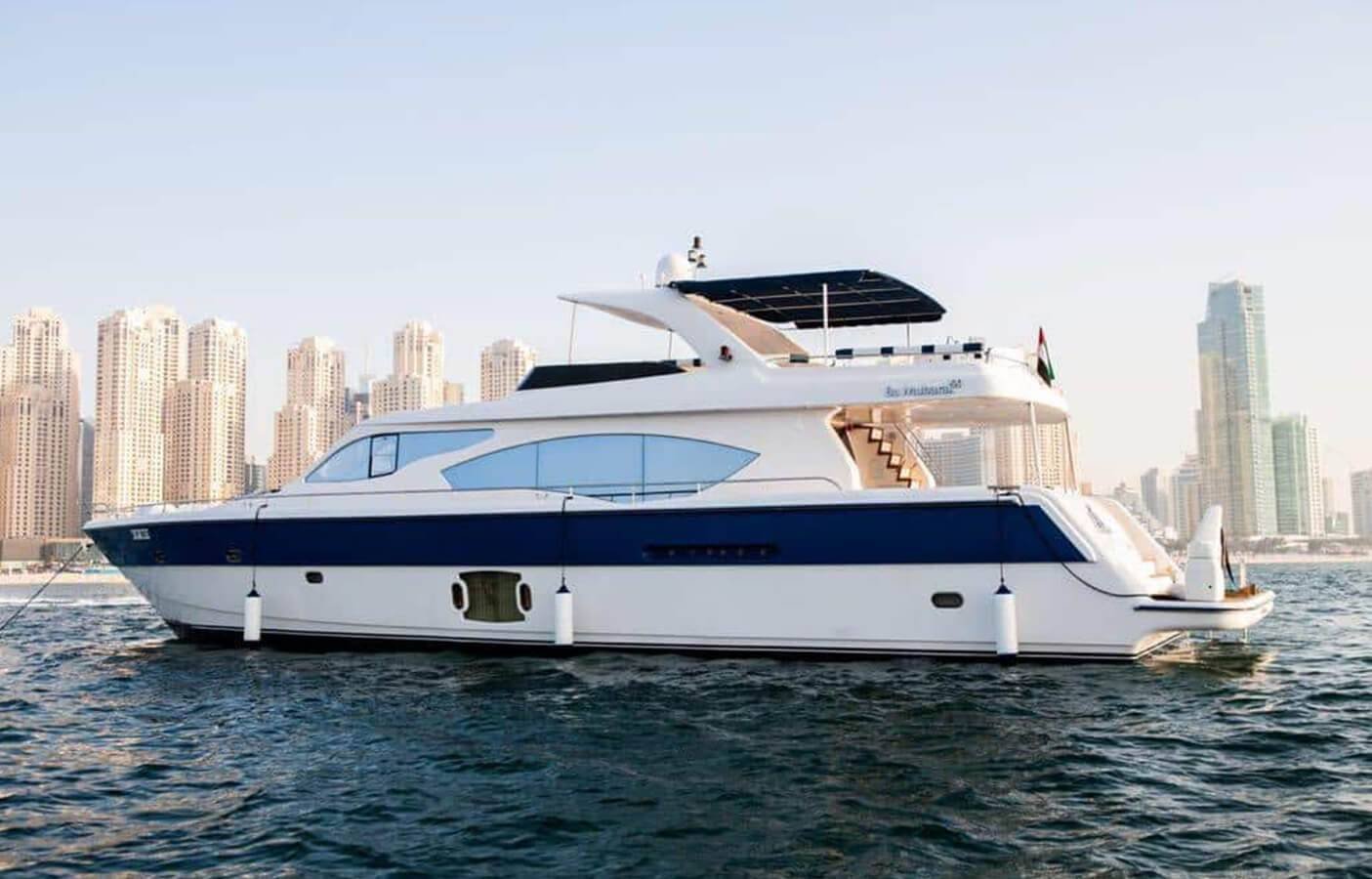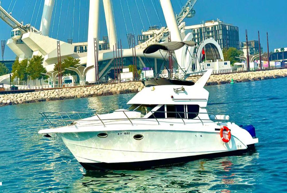 Our company is pleased to present the 88 Feet double-deck Luxury private yacht rental Dubai in Aed 899 each hour . Our Yacht, offering superb amenities for your unforgettable experience. With a spacious hall, two bedrooms, washroom, kitchen, music system, and comfortable seating on the flybridge, this yacht ensures your utmost comfort and enjoyment during your cruise.