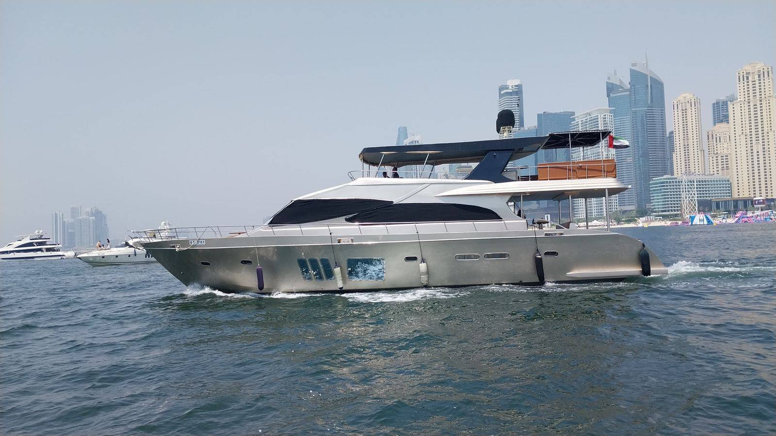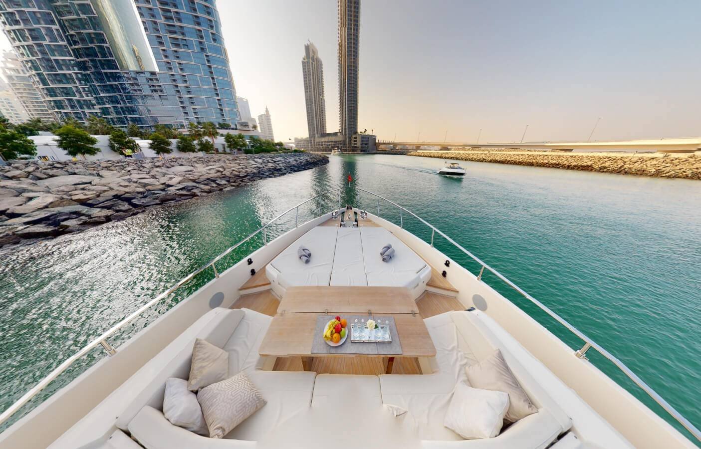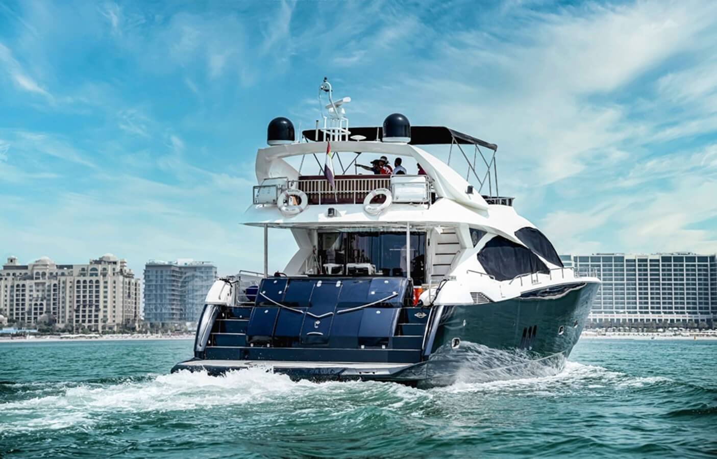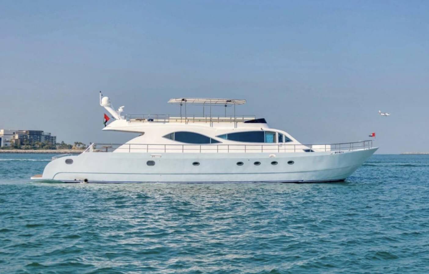 Our company is pleased to present the 88 Feet double-deck Luxury private yacht rental Dubai in Aed 899 each hour . Our Yacht, offering superb amenities for your unforgettable experience. With a spacious hall, two bedrooms, washroom, kitchen, music system, and comfortable seating on the flybridge, this yacht ensures your utmost comfort and enjoyment during your cruise.