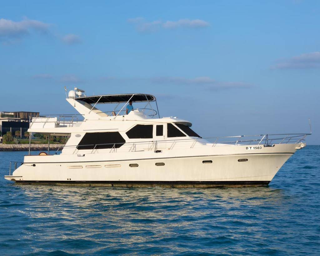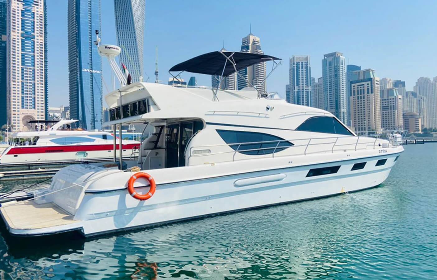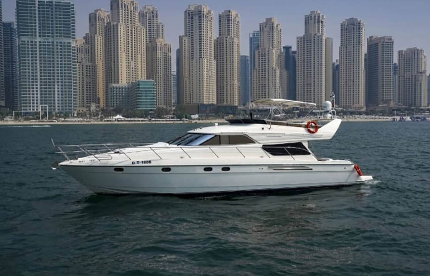 Our company is pleased to present the 50 Feet double-deck Luxury private yacht rental Dubai in Aed 450 each hour . Our Yacht, offering superb amenities for your unforgettable experience. With a spacious hall, two bedrooms, washroom, kitchen, music system, and comfortable seating on the flybridge, this yacht ensures your utmost comfort and enjoyment during your cruise.