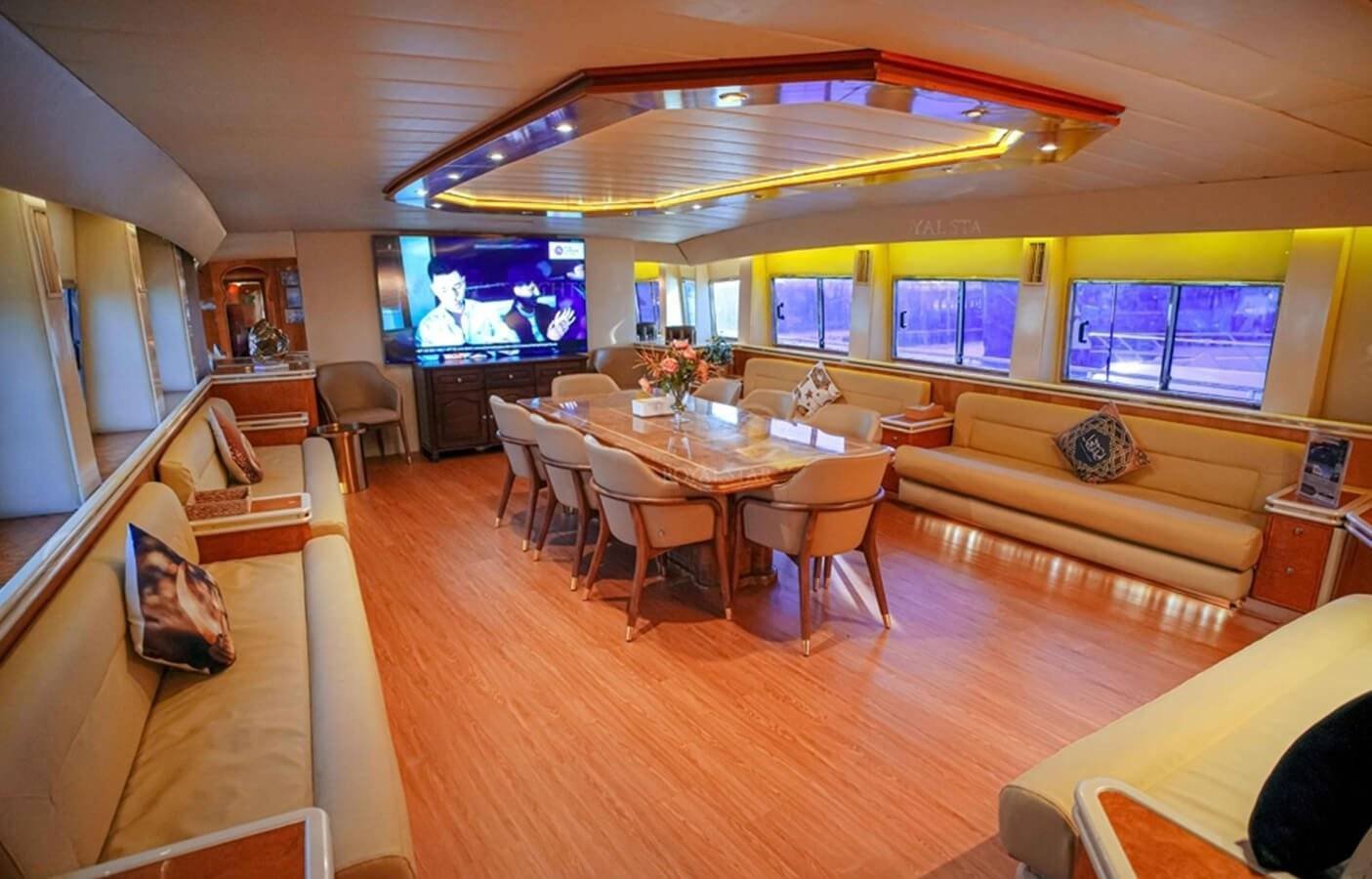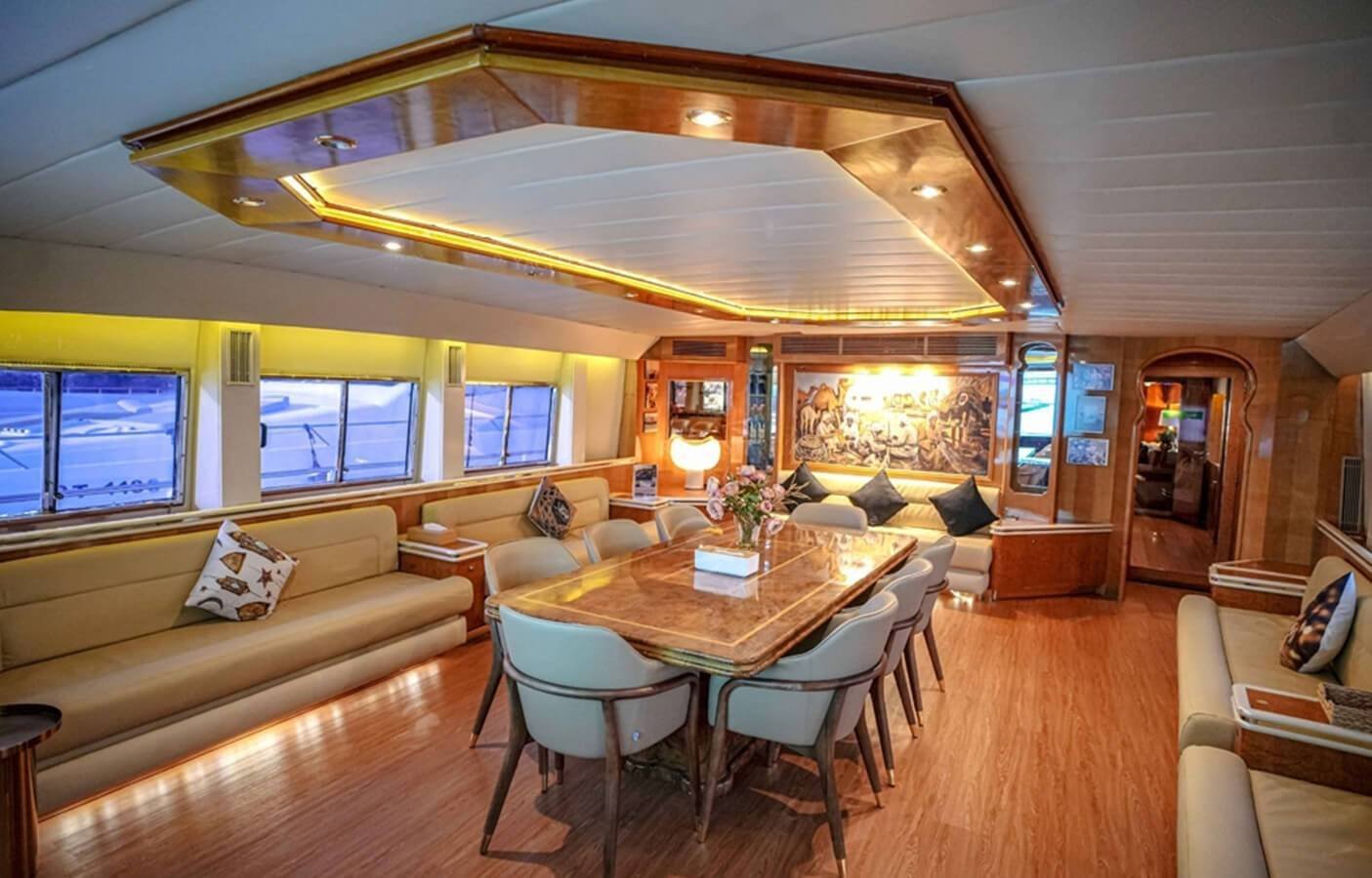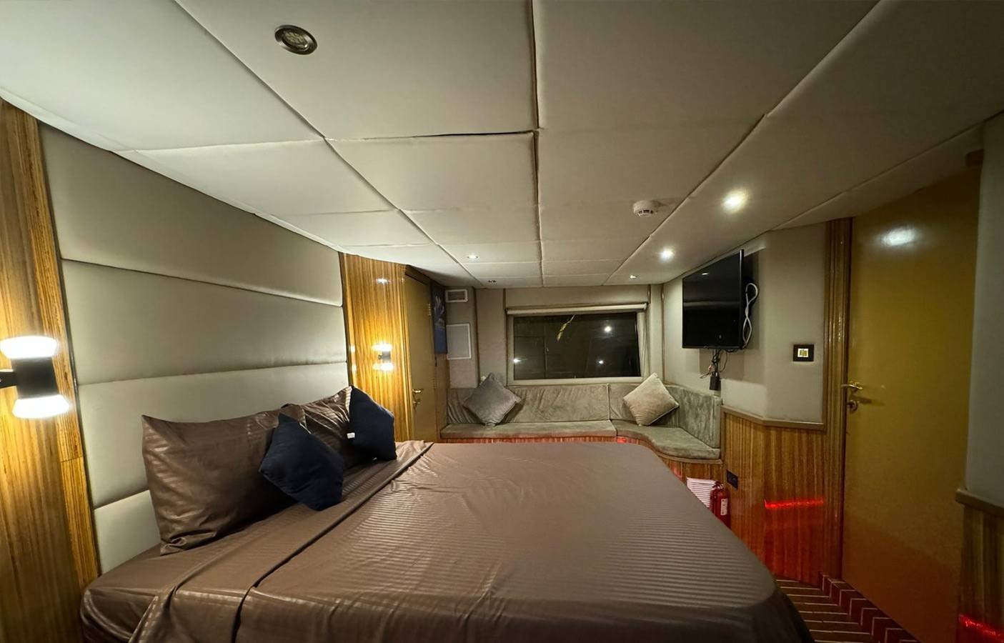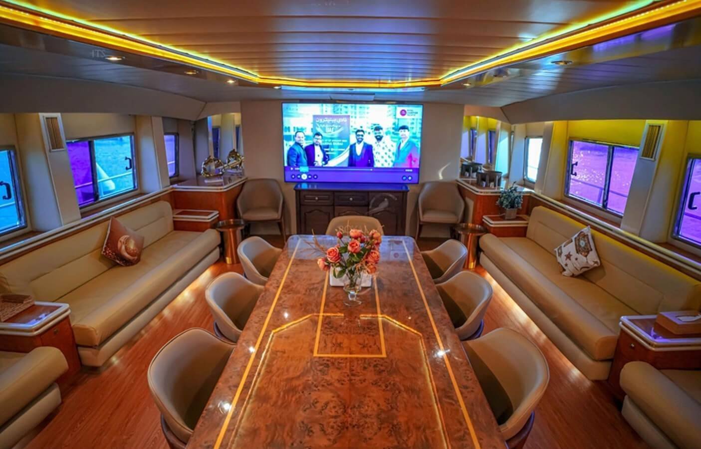 You can also make the private yacht booking of This Super Luxury 135 feet Yacht which is having 4-bed room with 2 very spacious Hall along with the washroom kitchen Satellite television, Music system and the very nice sitting place on the fly bride as well. Our price is Aed 3999 Each hour Only . Our offer include the water soft drinks and ice along with very good music system and fully Air conditioned yacht and you can also bring your own food and drinks in yacht.