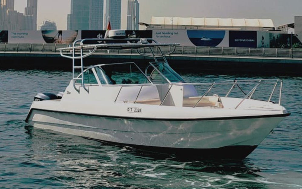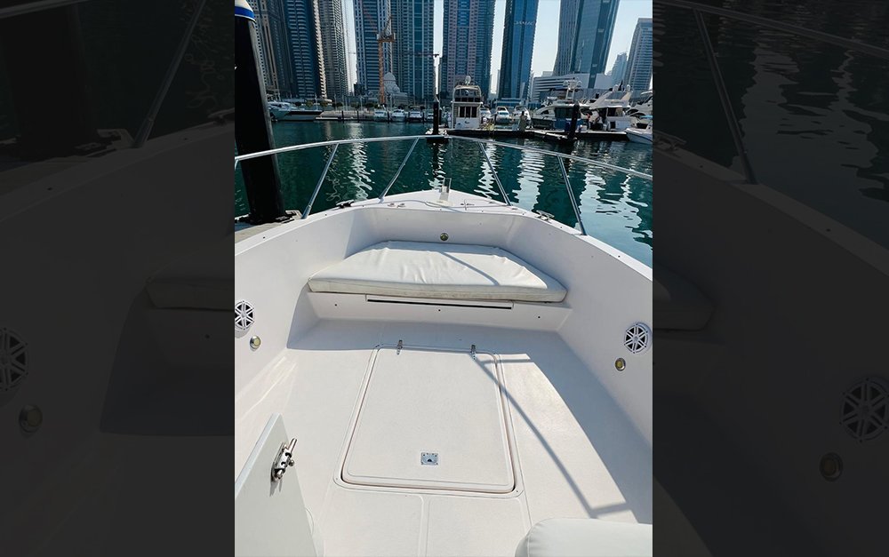 Our company is pleased to present the 40 FeeT Yacht for private yacht rental in Dubai at AED 375 per hour, accommodating up to 10 guests. This elegant yacht offers excellent amenities for a comfortable and enjoyable cruising experience, including a cozy lounge area, washroom, music system, and relaxing seating for leisure and entertainment.