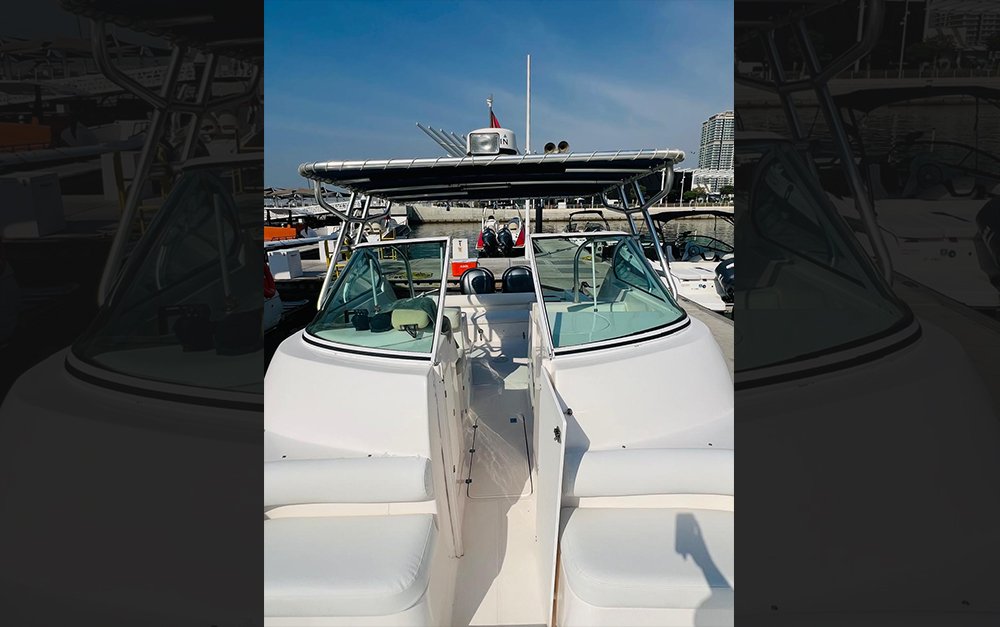 Our company is pleased to present the Pearl Voyage 34 FT Luxury Yacht for private yacht rental in Dubai at AED 299 per hour, accommodating up to 8 guests. This elegant yacht offers excellent amenities for a comfortable and enjoyable cruising experience, including a cozy lounge area, washroom, music system, and relaxing seating for leisure and entertainment.